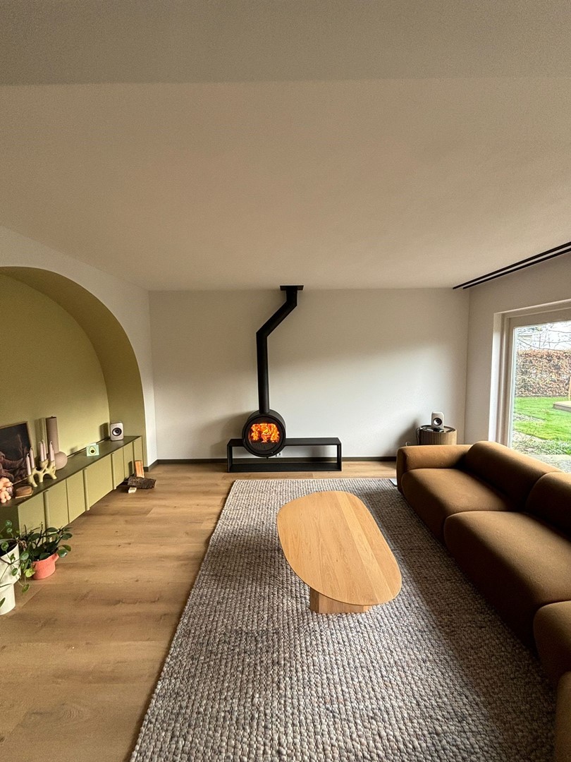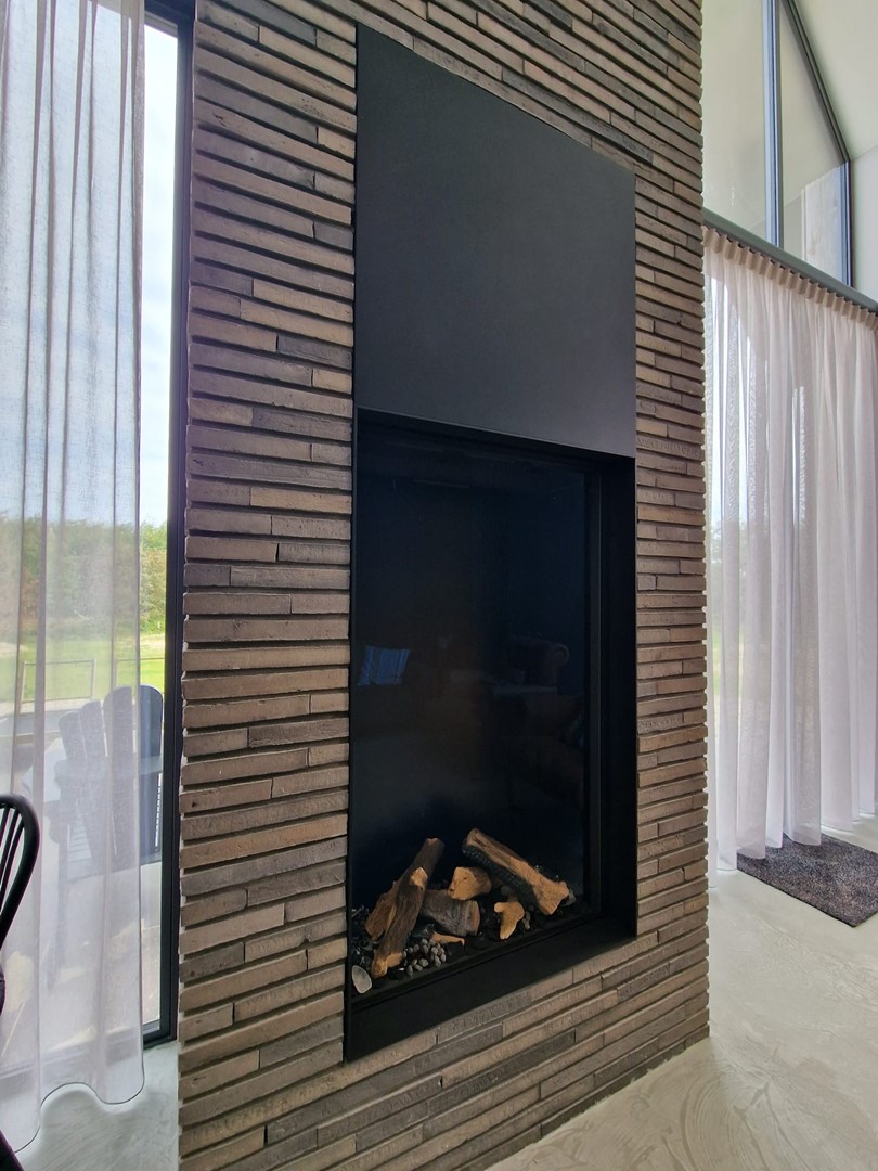 Pelletkachel Vigo met zwart geëpoxeerd kanaal langs de gevel